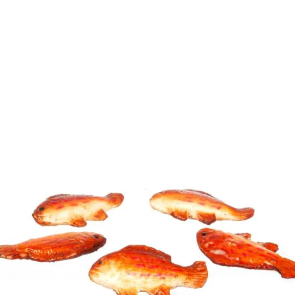 These five mini red snapper are 1/12 scale, which is the most common scale for dollhouses and dollhouse miniatures. It means that if an object is 12 inches in real life, it is sized down to a one inch as a miniature. Each one measures 1.125″ H x .675″ W x .675″ D.
