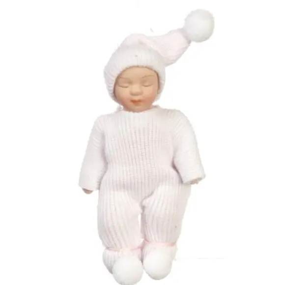 This little babe is made of porcelain and comes dressed in a pale pink cotton long sleeved sleeper and stocking cap. She measures 1 1/2″ W x 2 3/4″ H x 3/4″ D and is 1/12 scale, which is the most common scale for dollhouses and dollhouse miniatures. It means that if an object is 12 inches in real life, it is sized down to a one inch as a miniature.