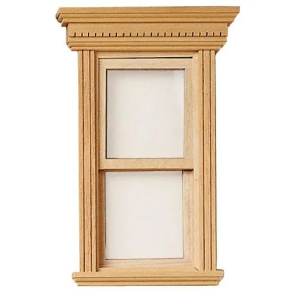 This working window is made from unfinished wood and is double hung with detailed dentil molding, mullions, interior trim, and and acrylic pane. It measures 3 13/16″ W x 5 13/16″ H and fits openings of 2 9/16″ W x 5 1/16″ H x 1/2″ D. It is 1/12 scale, which is the most common scale for dollhouses and dollhouse miniatures. It means that if an object is 12 inches in real life, it is sized down to a one inch as a miniature.