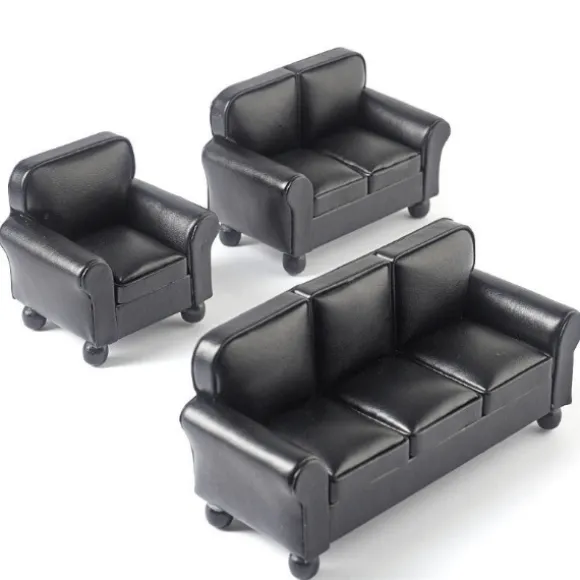Create a sleek and timeless mini living room with this black leather living room set. Each piece is 1/12 scale, which is the most common scale for dollhouses and dollhouse miniatures. This means that if an object is 12 inches in real life, it is sized down to a one inch as a miniature. They measure: