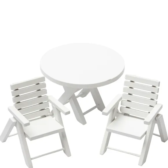 This cozy patio set comes with a table and two Adirondack-style chairs. It is 1/12 scale, which is the most common scale for dollhouses and dollhouse miniatures. This means that if an object is 12 inches in real life, it is sized down to a one inch as a miniature. Each piece measures: