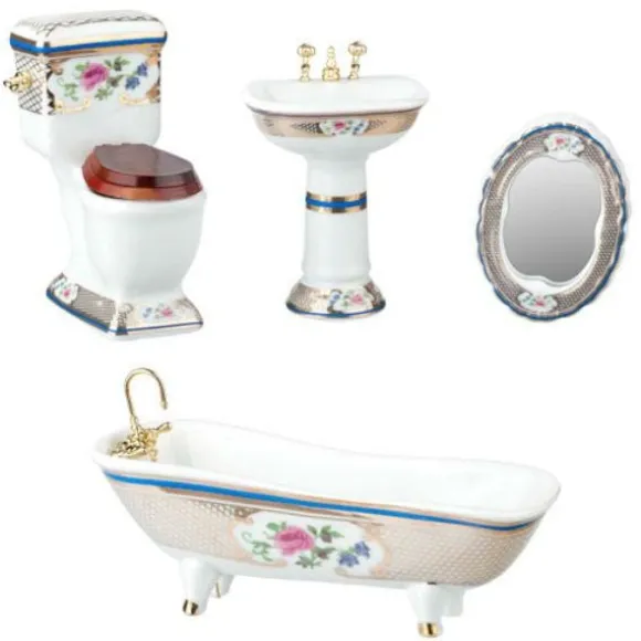 This porcelain set features a lovely design and gold trim and fixtures. It includes: