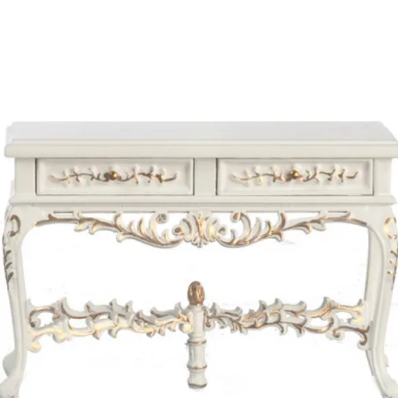 This gorgeous white side table stuns with intricate carvings and beautiful, high-quality wood. It is 1/12 scale, which is the most common scale for dollhouses and dollhouse miniatures. It means that if an object is 12 inches in real life, it is sized down to a one inch as a miniature. It measures 4 1/8″ W x 2 1/16″ H x 1 3/4″ D