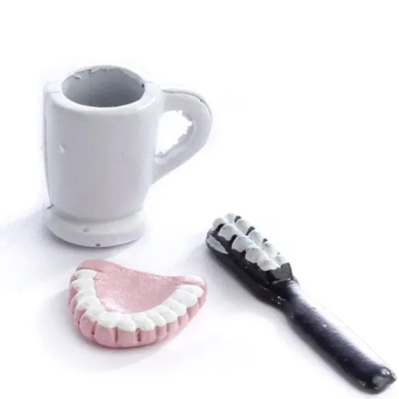 You get a cup, false teeth, and toothbrush in this set. (Please note the color of the toothbrush varies by order.) They are 1/12 scale, which is the most common scale for dollhouses and dollhouse miniatures. It means that if an object is 12 inches in real life, it is sized down to a one inch as a miniature. They measure:
