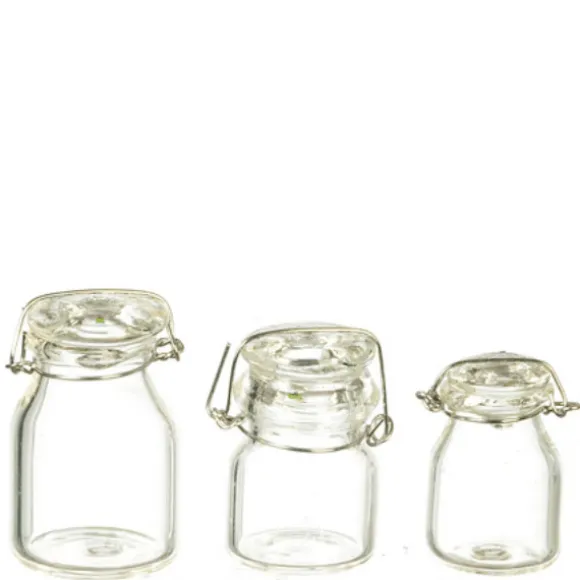 The three mini canisters in this set are made of glass and wire. They are 1/12 scale, which is the most common scale for dollhouses and dollhouse miniatures. It means that if an object is 12 inches in real life, it is sized down to a one inch as a miniature. They measure: