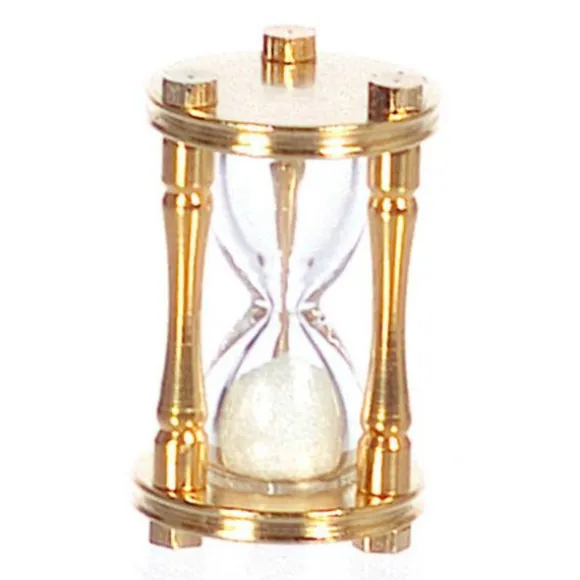 The sand inside this brass hourglass really moves! It is 1/12 scale, which is the most common scale for dollhouses and dollhouse miniatures. It means that if an object is 12 inches in real life, it is sized down to a one inch as a miniature. It measures 13/16″ H x 1/2″ D.