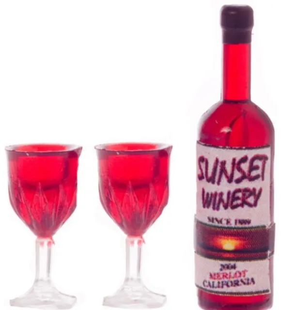 You get one mini bottle of wine and two wine glasses in this set. They are 1/12 scale, which is the most common scale for dollhouses and dollhouse miniatures. It means that if an object is 12 inches in real life, it is sized down to a one inch as a miniature. The bottle measures 1/4″ W x 1″ H and each glass measures 1/2″ tall.