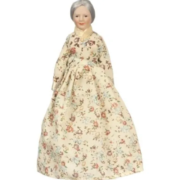 This grandmother dollhouse doll is made of porcelain and has movable parts. She sports a full-length dress, white pantaloons, and black painted shoes. Her clothes are not removable. Their shoes are painted on so you never have to worry about losing them.