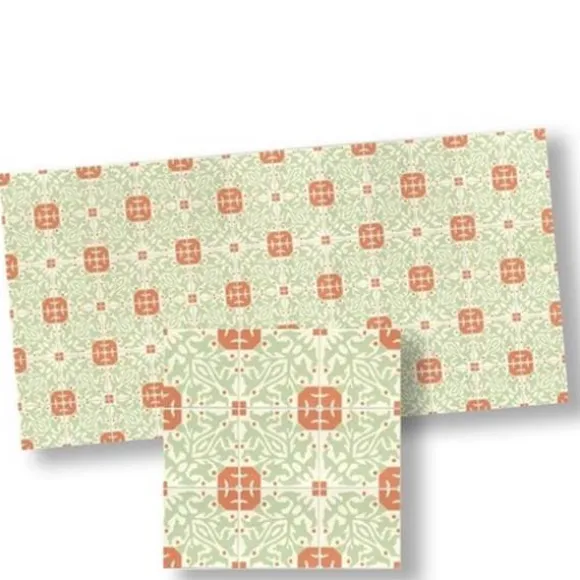 This green and terra cotta mosaic dollhouse tile flooring is made of plastic with a matte finish. We recommend using double-sided craft tape to adhere it to your floor and then spraying it with a few light coats of clear spray matte sealer to ensure longevity. It is scored at the grout for simple crack-and-snap assembly. It measures 9-1/2″ x 4-3/4″.