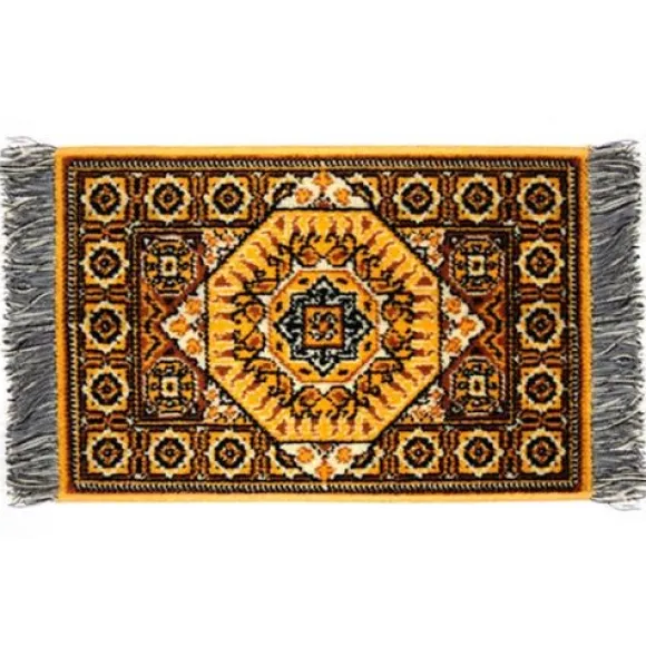 There geometric design on this exotic wool and velour rug is so mesmerizing. It is 1/12 scale, which is the most common scale for dollhouses and dollhouse miniatures. It means that if an object is 12 inches in real life, it is sized down to a one inch as a miniature. It measures 9 3/4″ x 15″.