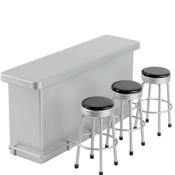 Add a touch of the fabulous ’50s to your kitchen with this vintage-inspired counter and three tall stools. It is 1/12 scale, which is the most common scale for dollhouses and dollhouse miniatures. It means that if an object is 12 inches in real life, it is sized down to a one inch as a miniature. Each piece measures: