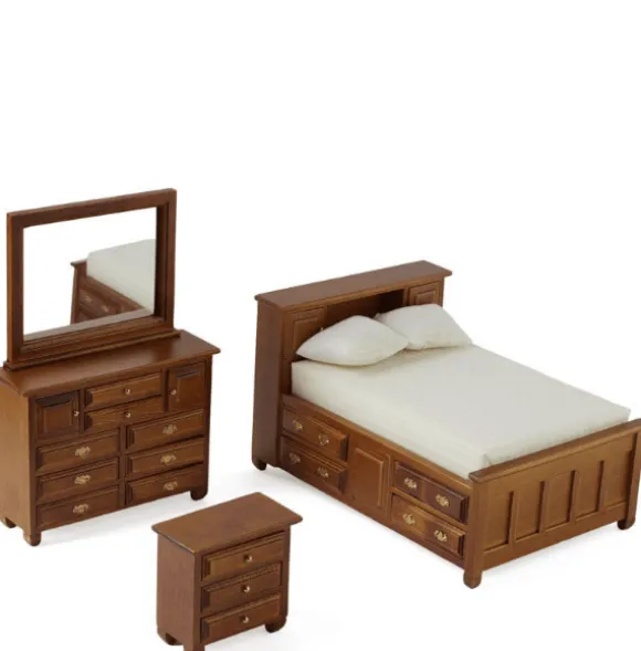 This sleek black bedroom set is made of solid wood and gold hardware. All of the doors you see actually open and close! Each piece is 1/12 scale, which is the most common scale for dollhouses and dollhouse miniatures. It means that if an object is 12 inches in real life, it is sized down to a one inch as a miniature. They measure: